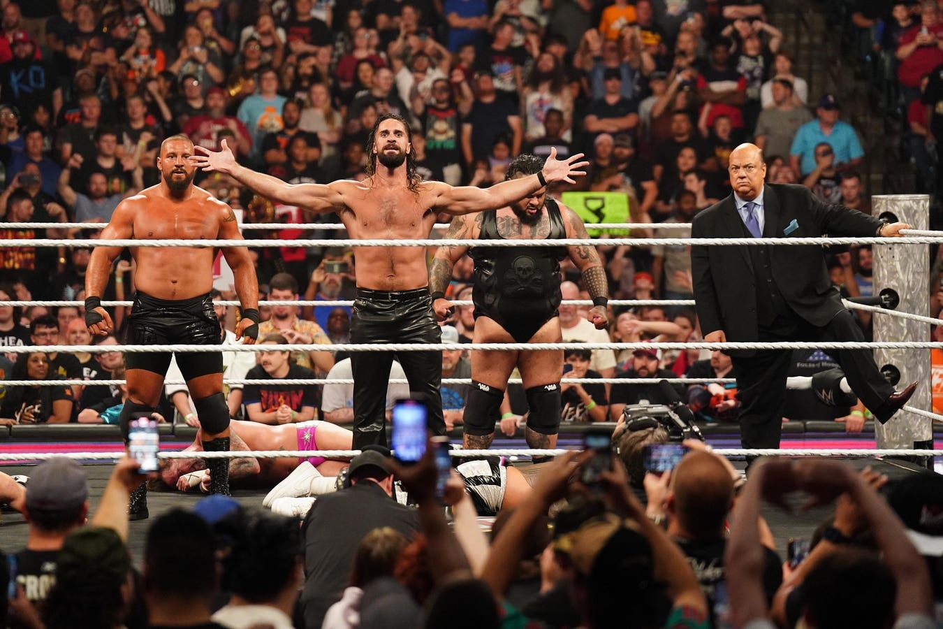 TULSA, OKLAHOMA – JUNE 02: Bron Breakker, Seth Rollins, Bronson Reed and Paul Heyman stand tall … More during Monday Night RAW at BOK Center on June 2, 2025 in Tulsa, Oklahoma. (Photo by Rich Freeda/WWE via Getty Images)