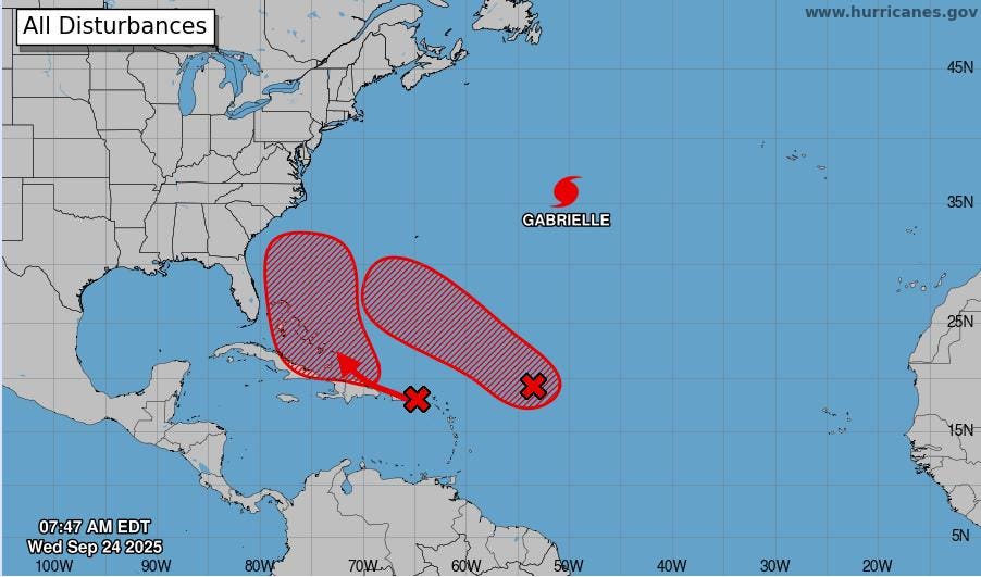 As of Wednesday morning, the National Hurricane Center is providing information on Hurricane Gabrielle, a system in the tropical Atlantic region, and one in the eastern Caribbean Sea. According to NHC, conditions are extremely favorable for both systems to form within seven days. The system in the central and western tropical Atlantic could become a tropical depression today or Thursday.