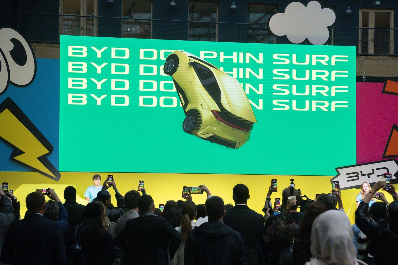 A launch event for BYD’s Dolphin Surf electric vehicle in Paris on May 21. Such low-priced models have led investors to fear a deeper price war in the industry. The Dolphin Surf will retail for €22,990 ($26,100).