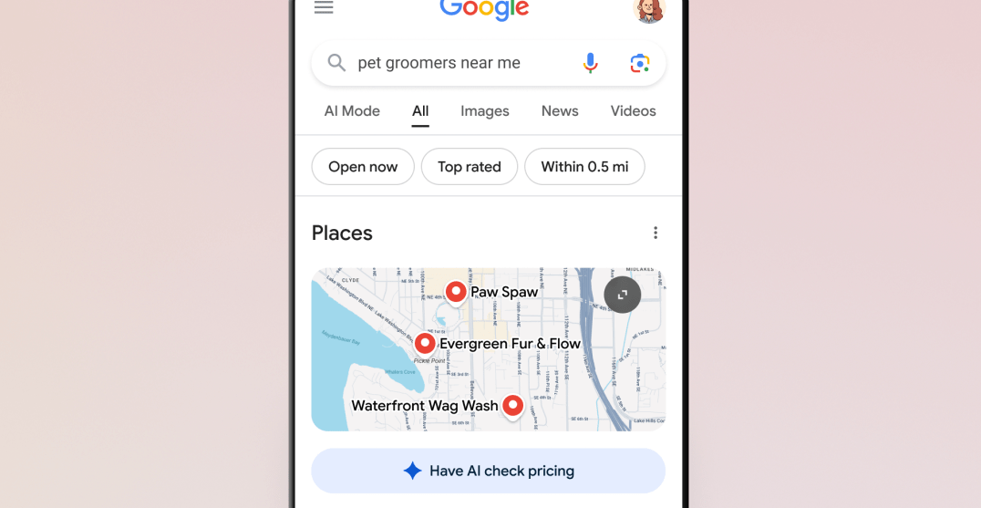 Google first started testing this feature in January, and it’s still only available for certain kinds of businesses, like pet groomers, dry cleaners, and auto shops. When you search for one of these services, like a pet groomer, Google will display a new “have AI check pricing” prompt beneath the business listing.