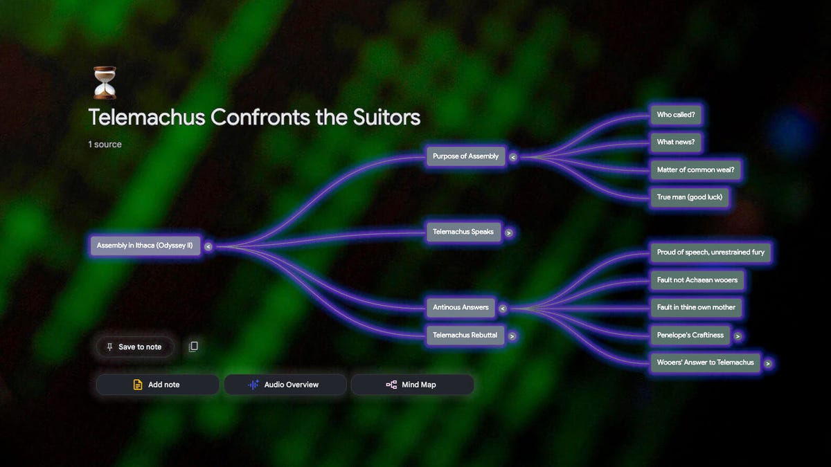 I’d heard interesting things about NotebookLM’s Mind Map feature, but I wanted to go in blind when I tried it out, so I did a separate test. I took roughly 1,500 words of Homer’s Odyssey and made that my only source. I then clicked the Mind Map button, and within seconds, an interactive and categorical breakdown of the text was displayed for me to poke around in.