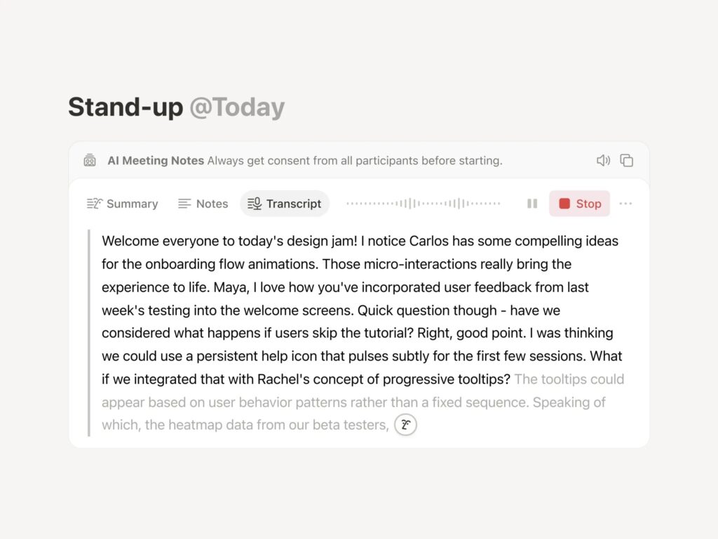 Transcriptions are searchable with AI, and you can start with the /meeting block within Notion.