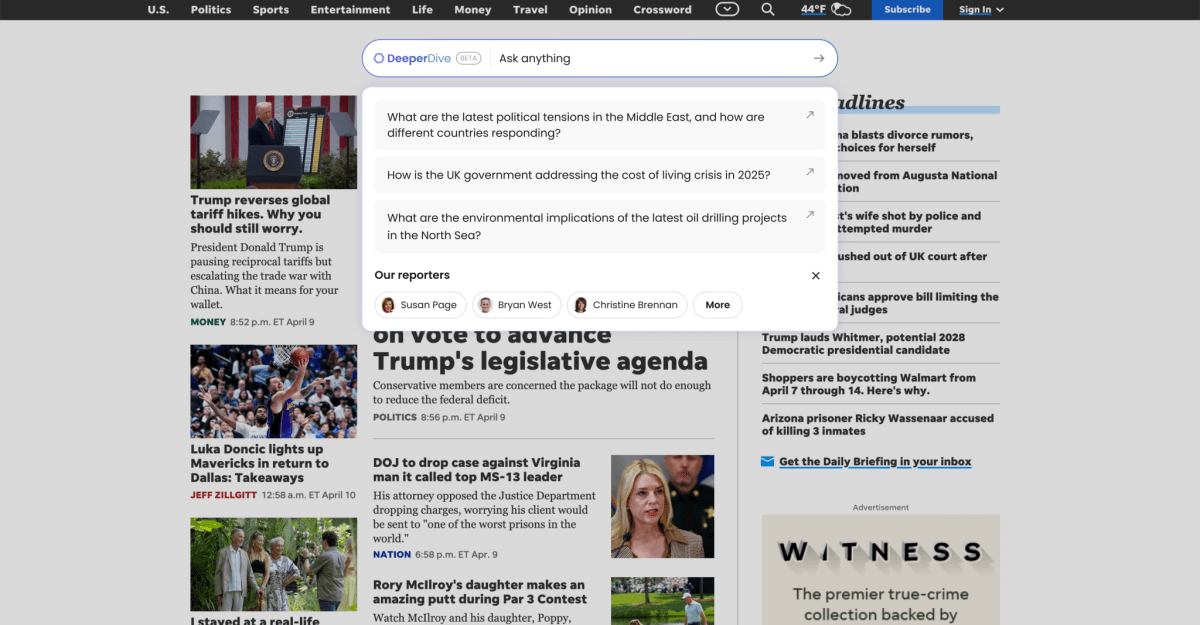 A demo on Taboola’s site shows a DeeperDive search bar at the top of USA Today’s homepage, which automatically surfaces prompts like “How is the UK government addressing the cost of living crisis in 2025?” and “What are the environmental implications of the latest oil drilling projects in the North Sea?”