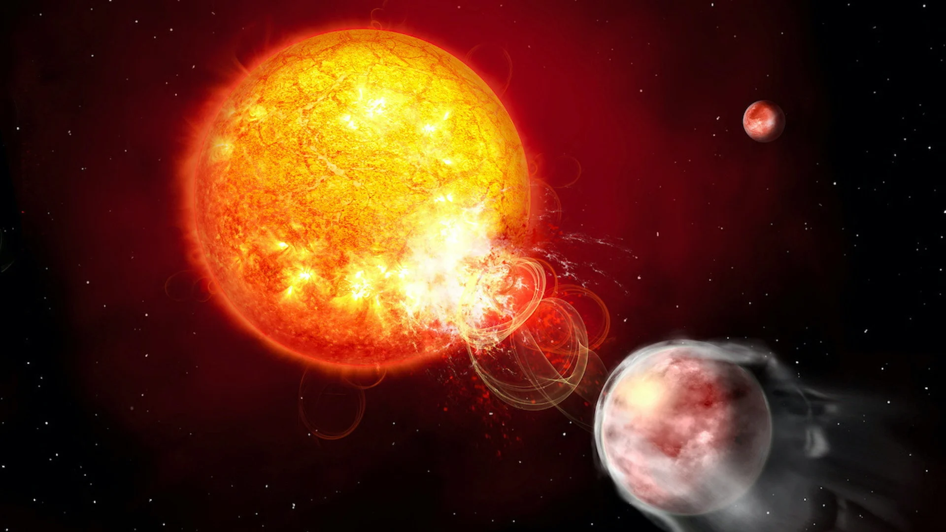 This exoplanet, as planets beyond our solar system are called, orbits its star so tightly that it appears to trigger flares from the stellar surface—larger than any observed from the sun—reaching several million miles (kilometers) into space and possibly stripping much of this unlucky world’s atmosphere.