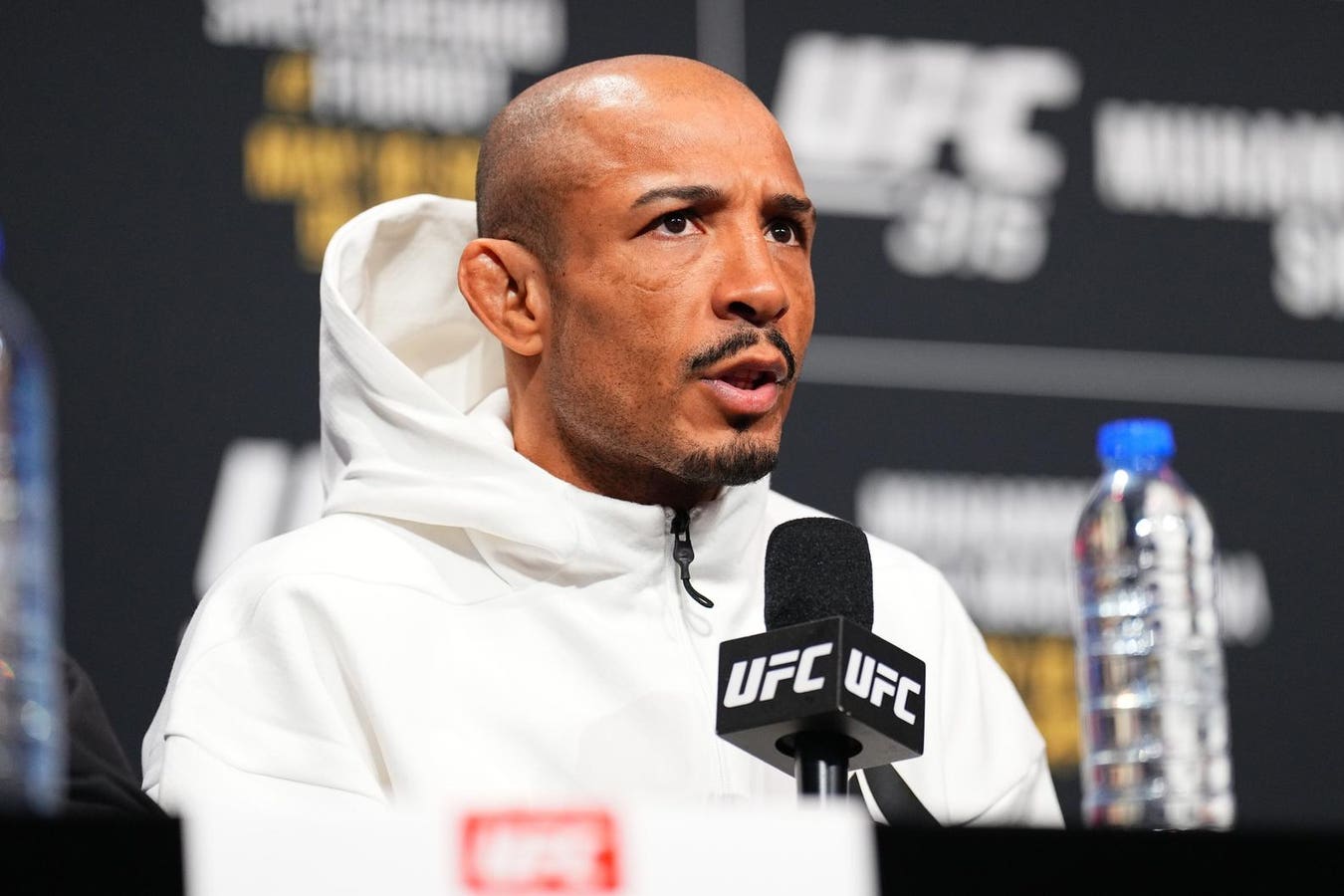 MONTREAL, QUEBEC – MAY 08: Jose Aldo of Brazil is seen on stage during the UFC 315 press conference … More
