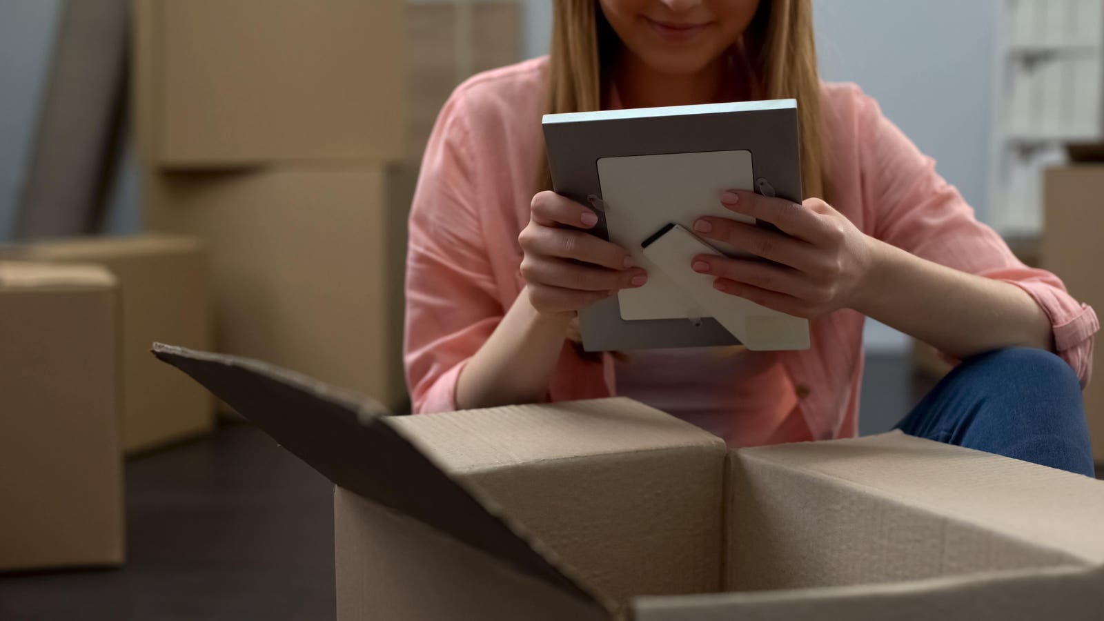 Student unpacking things in dormitory, looking at family photos