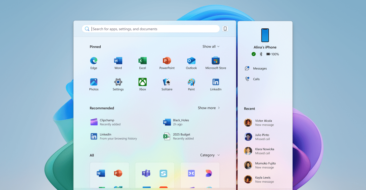 Aside from likely looking much better on large displays, the updated Windows 11 Start menu will have a new phone companion panel, giving quick access to recent contacts, messages, calls, battery level, and more on a synced iPhone or Android device.